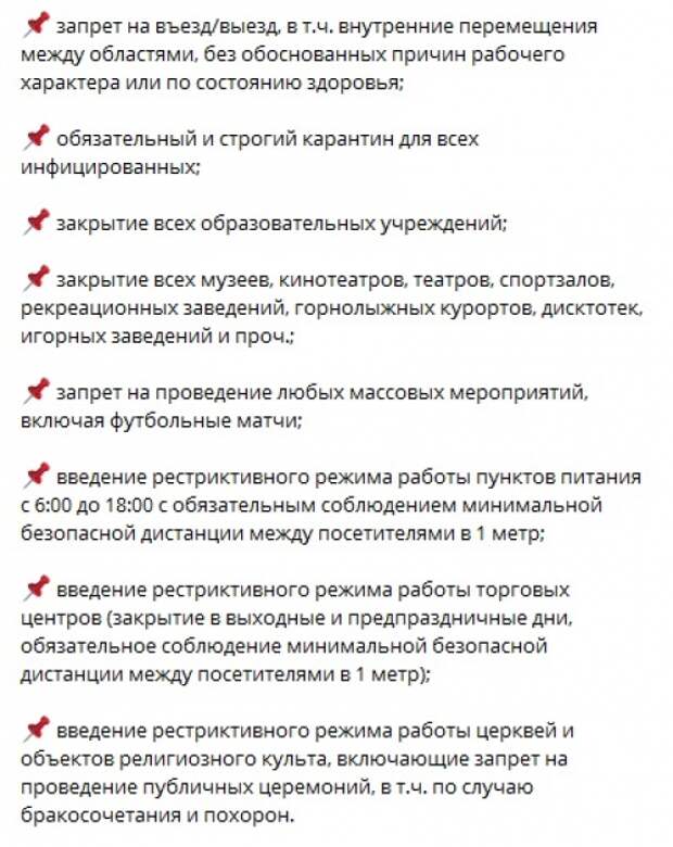 Будет разрешено работать тем ресторанам, которые смогут обеспечить достаточную дистанцию между посетителями.«Никаких школ, университетов, детских садов, спортивных секций. Дети должны сидеть дома. Никаких церковных служб, никаких свадебных и похоронных церемоний. Будут закрыты суды. Каждый житель закрытых районов обязан ежедневно измерять температуру, при повышении выше 37,0 он обязан остаться дома и ограничить контакты.
